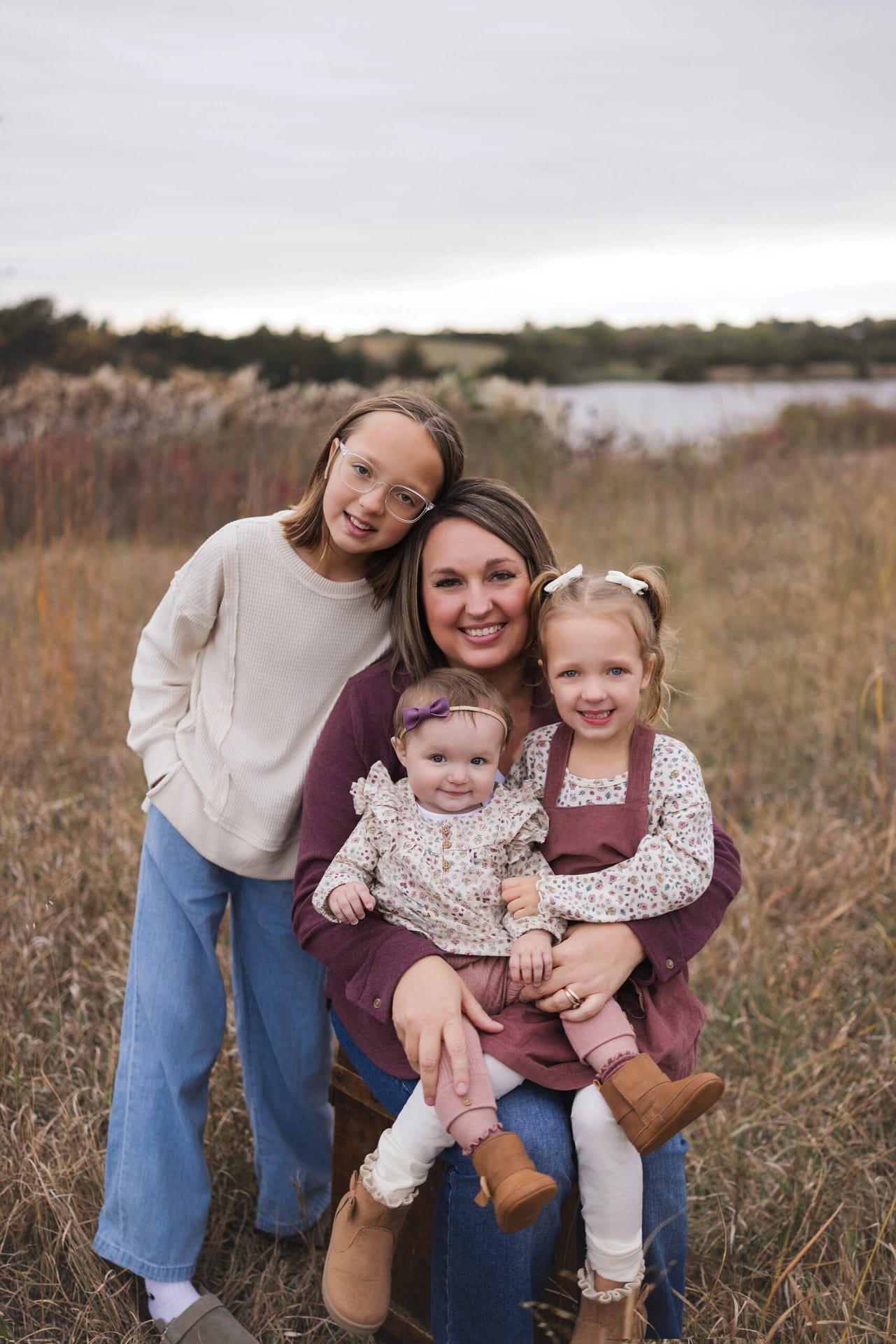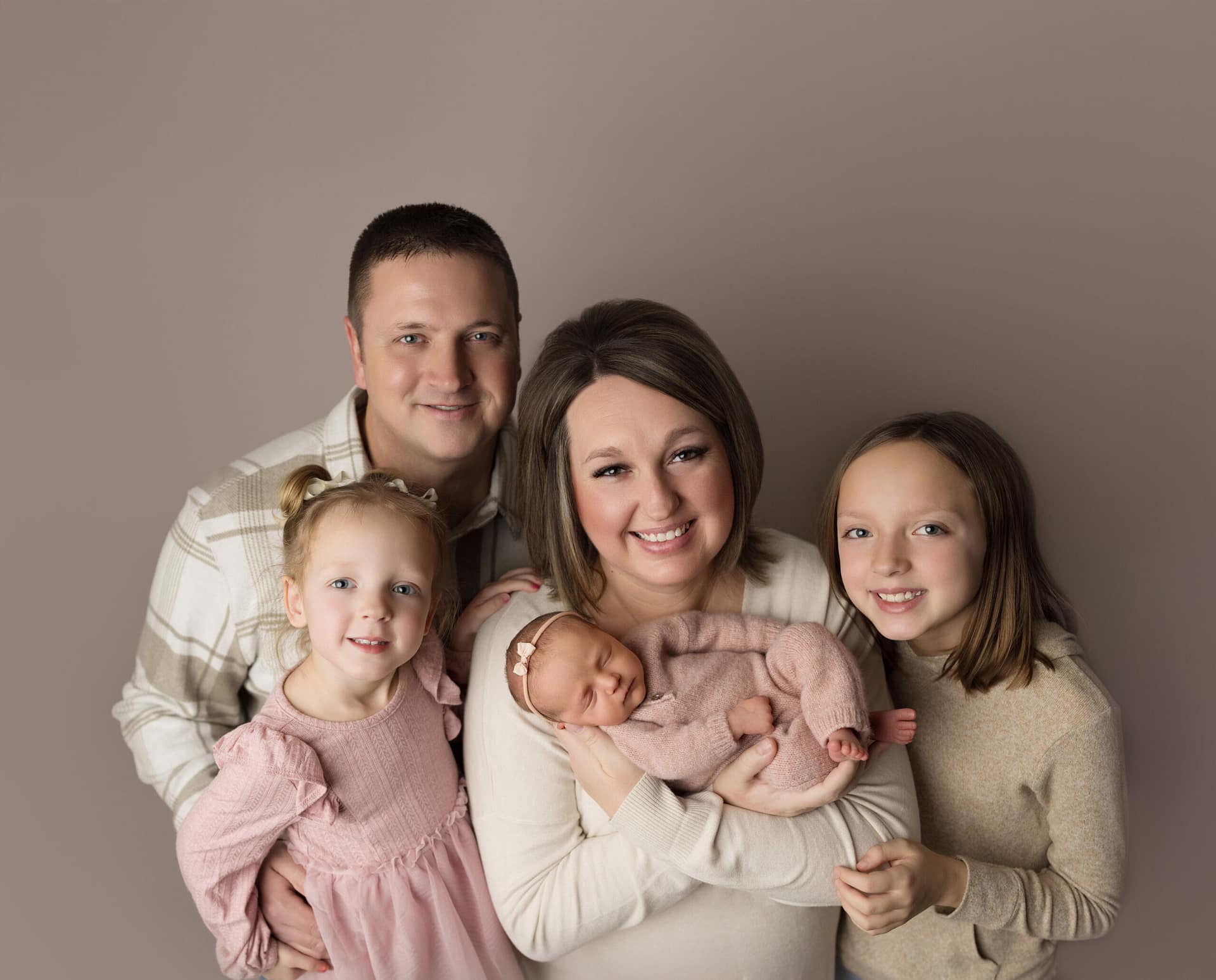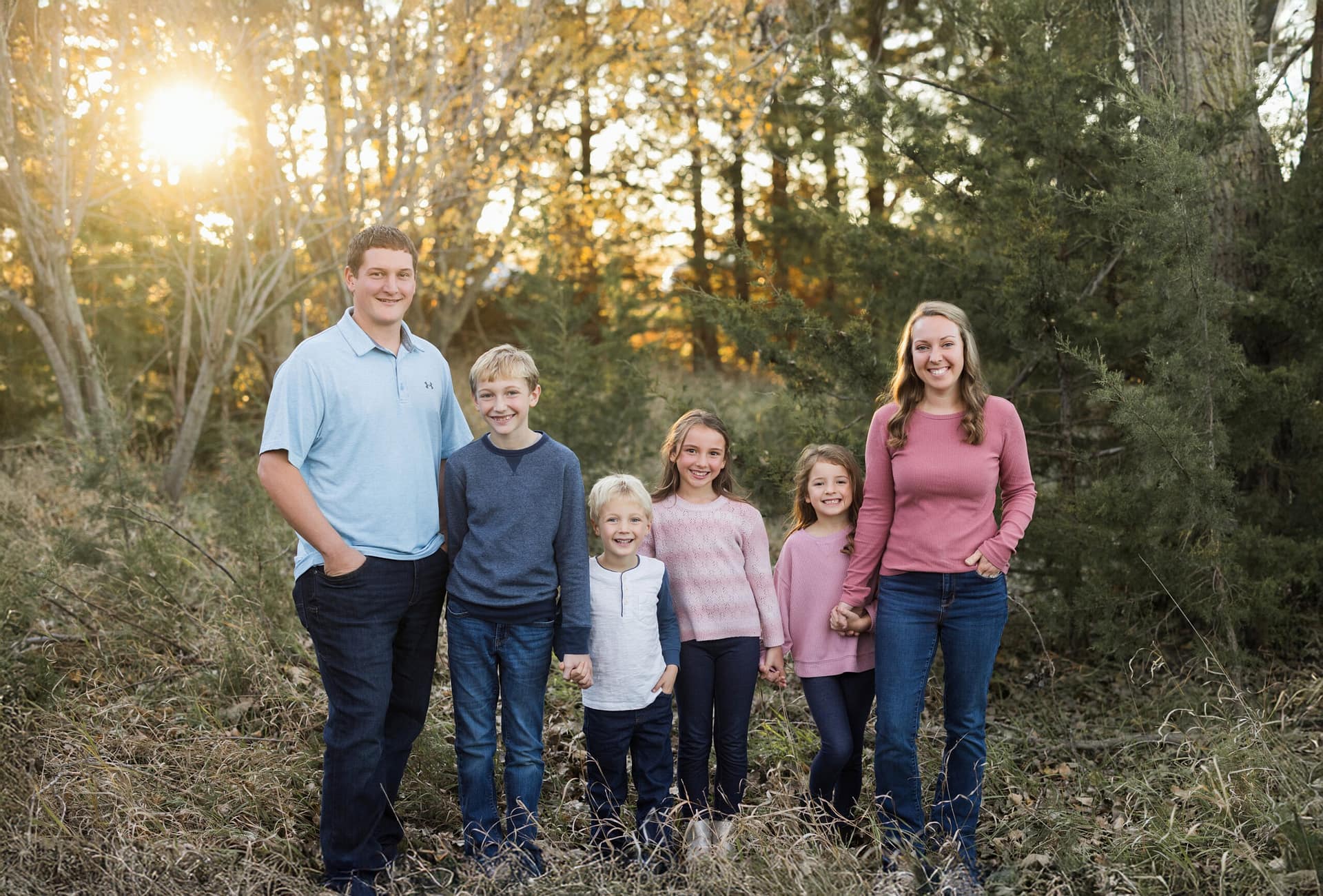 Newborn and milestone sessions are photographed in my studio in Tyndall, South Dakota. Family sessions are often held outdoors during golden hour in natural locations around Tyndall and surrounding communities.